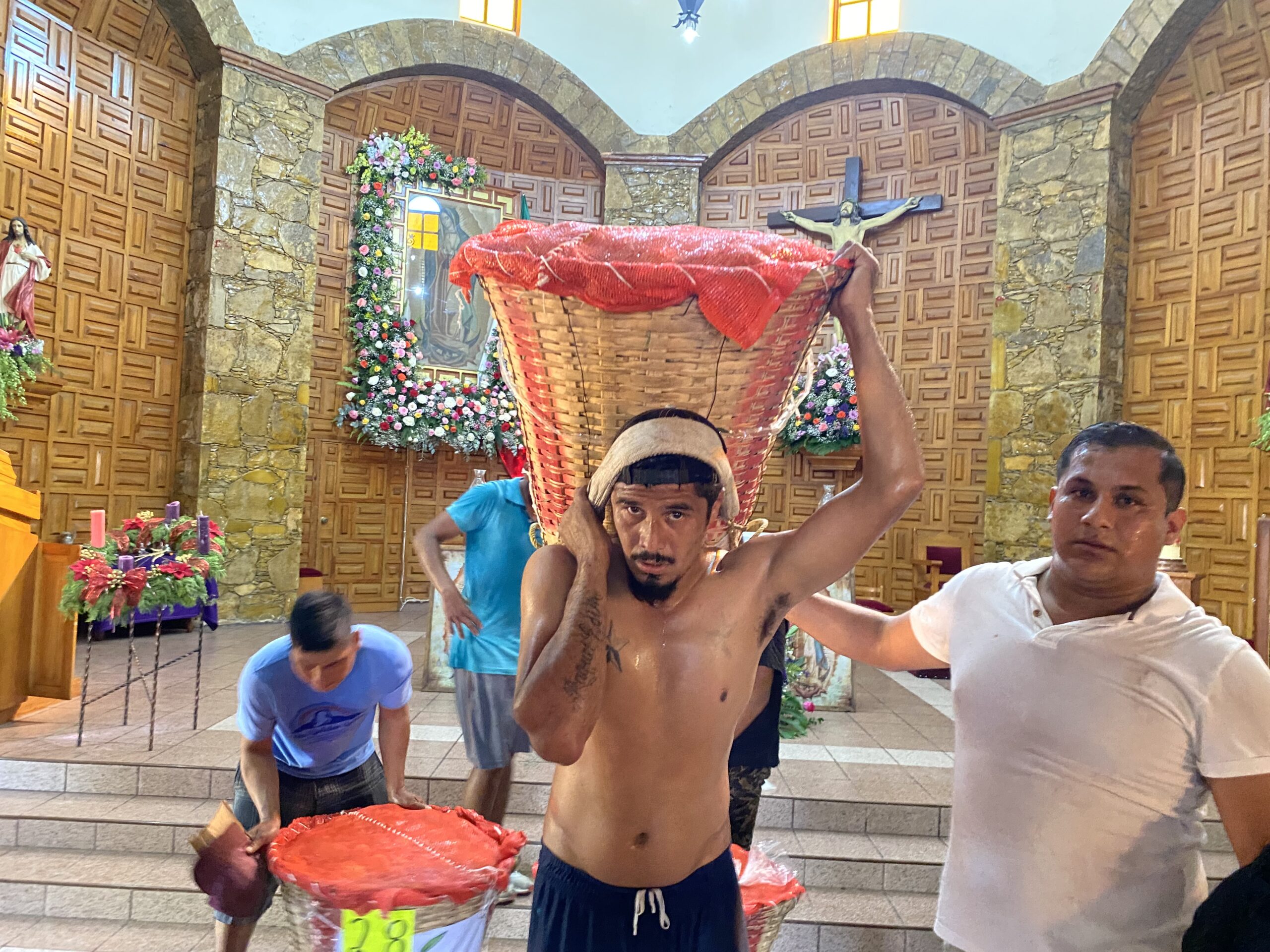 -65 kilos –dice con orgullo al pie del colote que pronto su “escuadra” de ayudantes le colocará sobre las espaldas.