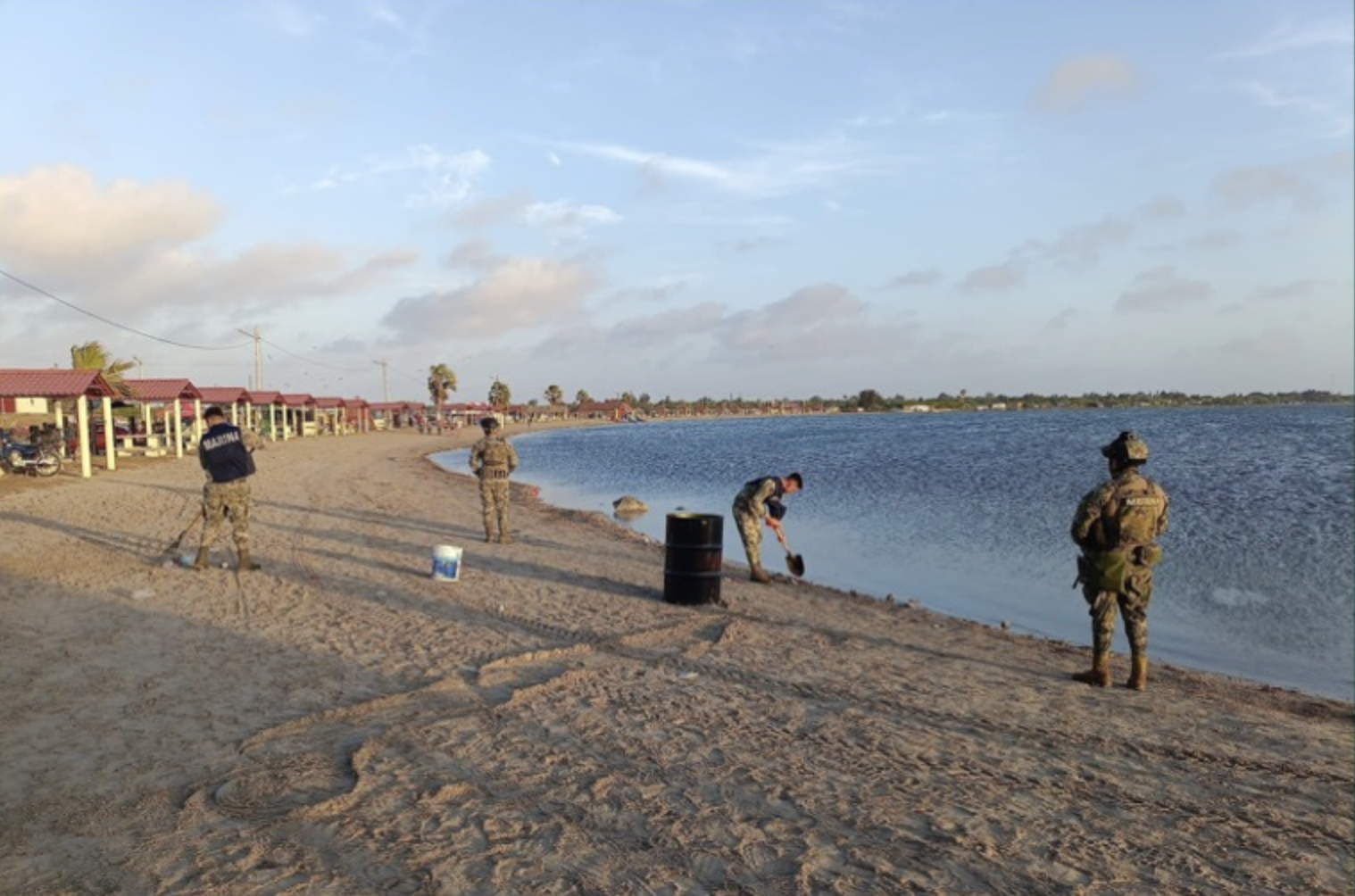 Se mantienen acciones para la contención de hidrocarburo en las costas del estado de Tamaulipas; en este contexto, personal de la Secretaría de Marina hoy recorrió aproximadamente 17 kilómetros en las playas Puerto Morelos (Mezquital) y Costa Azul (Bagdad), donde se recolectaron aproximadamente 236 kilogramos de hidrocarburo.